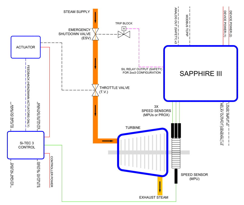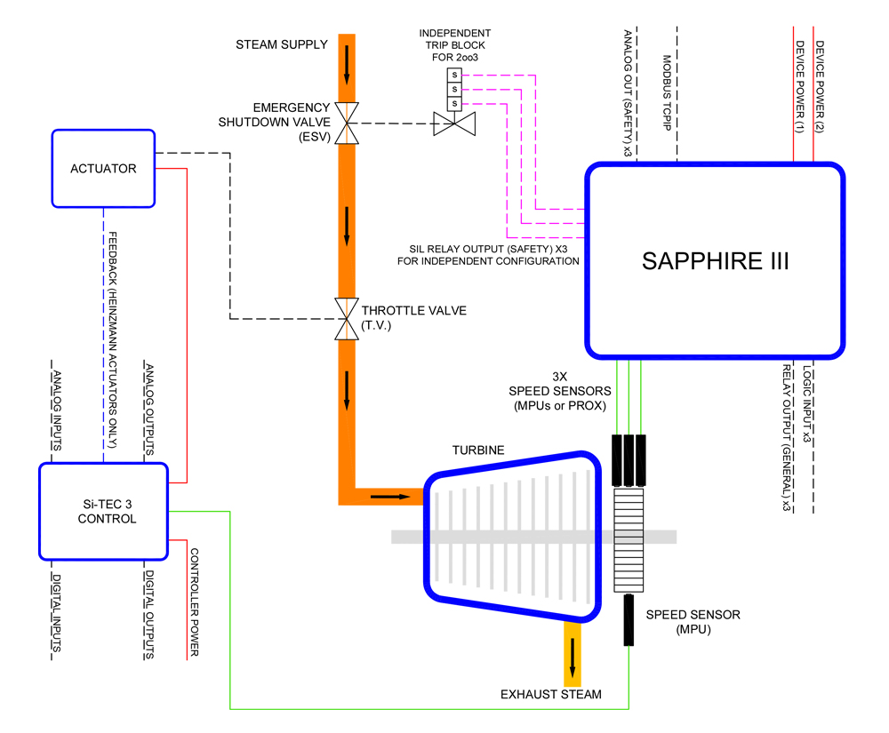 Sapphire II is a triple redundant overspeed protection for steam turbines, large diesel and gas engines and generators.
